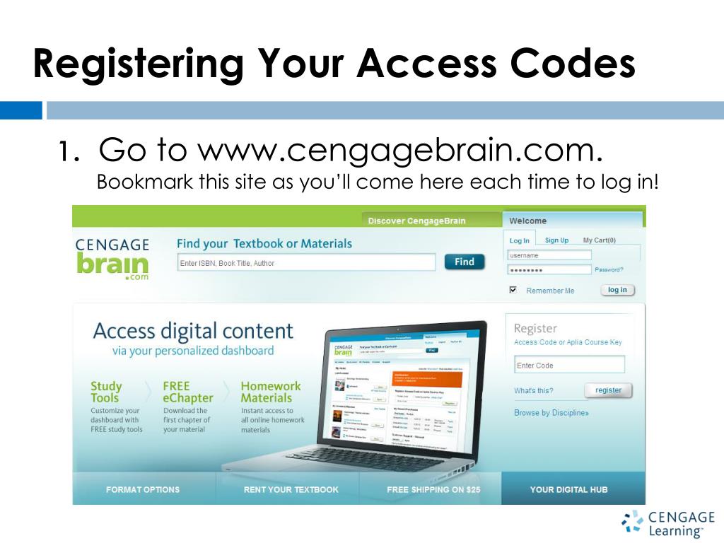 Registering Your Access Codes 1. Go to www.cengagebrain.com. Bookmark this site as you’ll come here each time to log in!