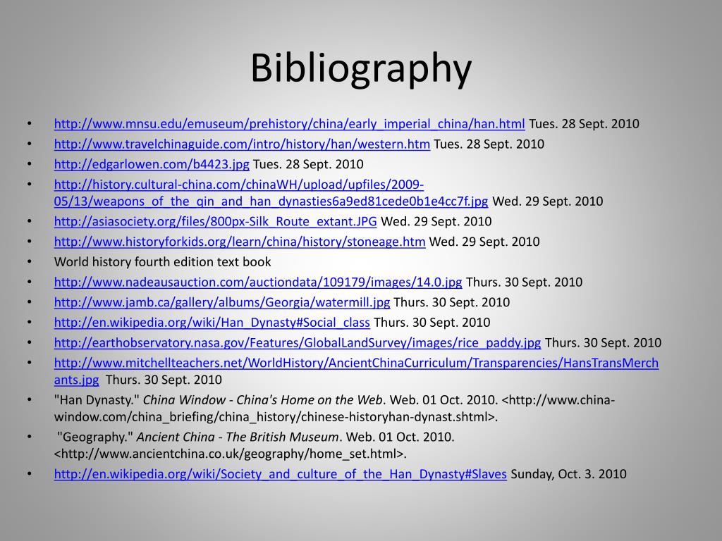 Bibliography • http://www.mnsu.edu/emuseum/prehistory/china/early_imperial_china/han.html Tues. 28 Sept. 2010 • http://www.travelchinaguide.com/intro/history/han/western.htm Tues. 28 Sept. 2010 • http://edgarlowen.com/b4423.jpg Tues. 28 Sept. 2010 • http://history.cultural-china.com/chinaWH/upload/upfiles/2009-05/13/weapons_of_the_qin_and_han_dynasties6a9ed81cede0b1e4cc7f.jpg Wed. 29 Sept. 2010 • http://asiasociety.org/files/800px-Silk_Route_extant.JPG Wed. 29 Sept. 2010 • http://www.historyforkids.org/learn/china/history/stoneage.htm Wed. 29 Sept. 2010 • World history fourth edition text book • http://www.nadeausauction.com/auctiondata/109179/images/14.0.jpg Thurs. 30 Sept. 2010 • http://www.jamb.ca/gallery/albums/Georgia/watermill.jpg Thurs. 30 Sept. 2010 • http://en.wikipedia.org/wiki/Han_Dynasty#Social_class Thurs. 30 Sept. 2010 • http://earthobservatory.nasa.gov/Features/GlobalLandSurvey/images/rice_paddy.jpg Thurs. 30 Sept. 2010 • http://www.mitchellteachers.net/WorldHistory/AncientChinaCurriculum/Transparencies/HansTransMerchants.jpg Thurs. 30 Sept. 2010 • "Han Dynasty." China Window - China's Home on the Web. Web. 01 Oct. 2010. <http://www.china-window.com/china_briefing/china_history/chinese-historyhan-dynast.shtml>. • "Geography." Ancient China - The British Museum. Web. 01 Oct. 2010. <http://www.ancientchina.co.uk/geography/home_set.html>. • http://en.wikipedia.org/wiki/Society_and_culture_of_the_Han_Dynasty#Slaves Sunday, Oct. 3. 2010