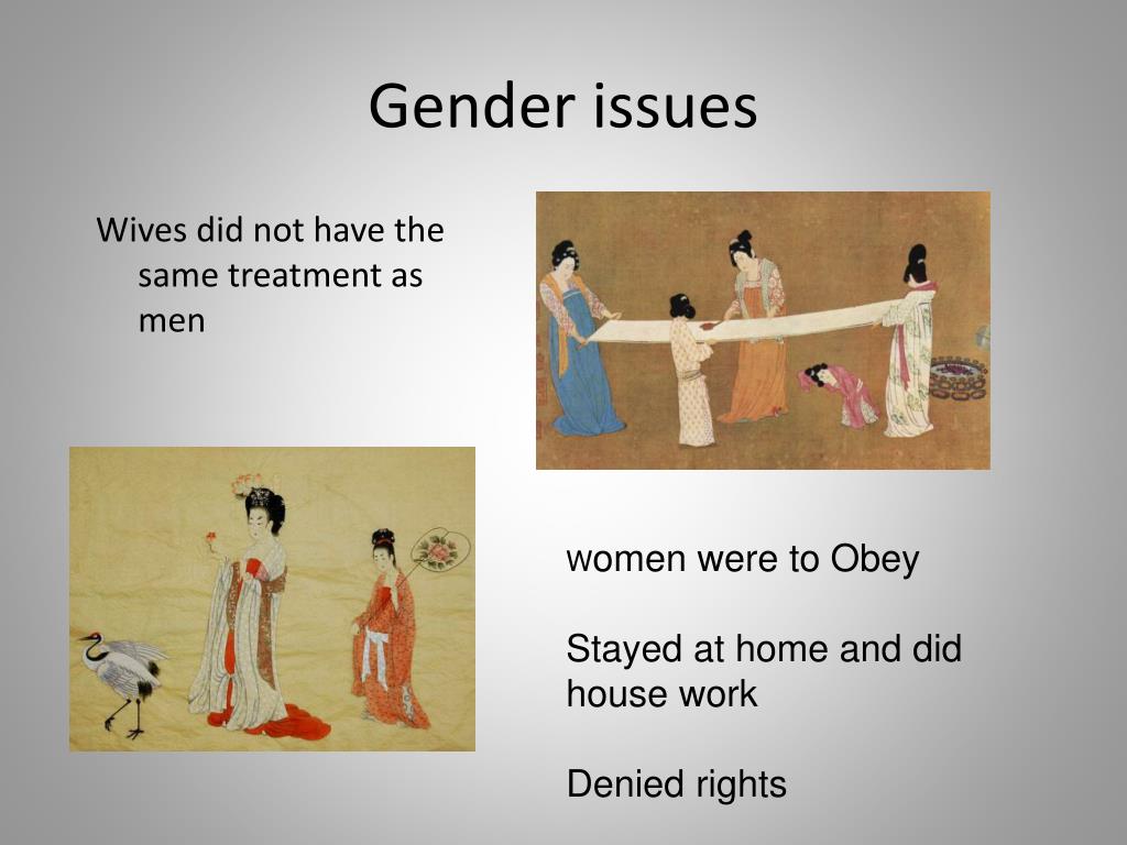Gender issues Wives did not have the same treatment as men Women were to Obey Stayed at home and did house work Denied rights