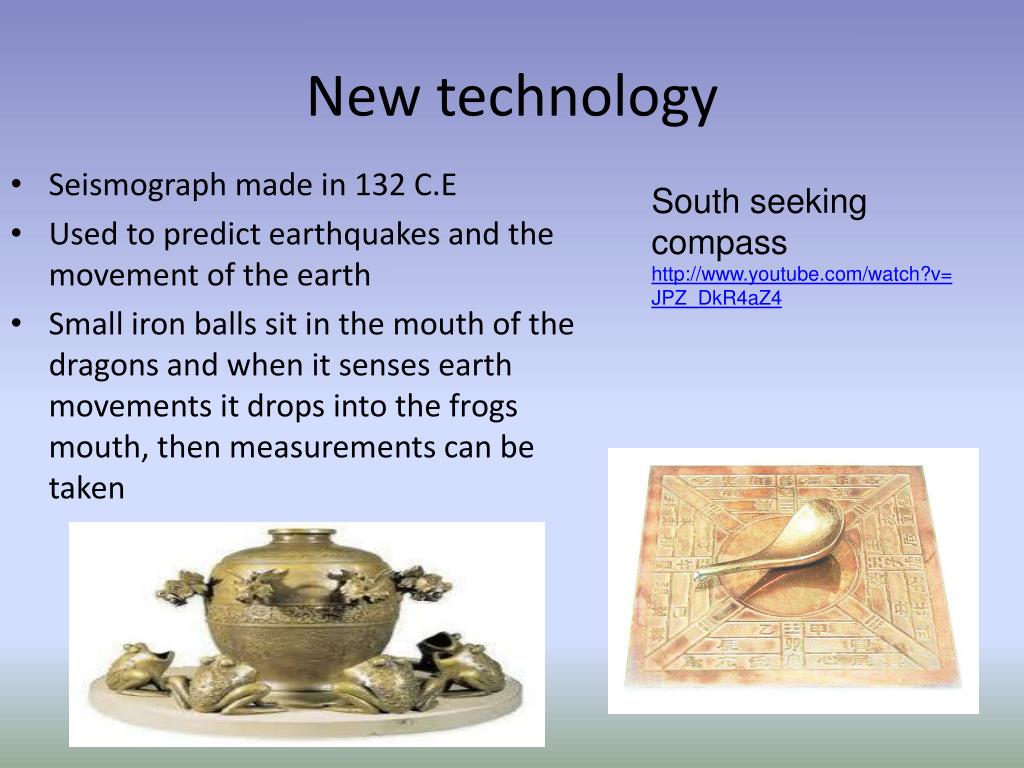 New technology South seeking compass http://www.youtube.com/watch?v=JPZ_DkR4aZ4 • Seismograph made in 132 C.E • Used to predict earthquakes and the movement of the earth • Small iron balls sit in the mouth of the dragons and when it senses earth movements it drops into the frogs mouth, then measurements can be taken