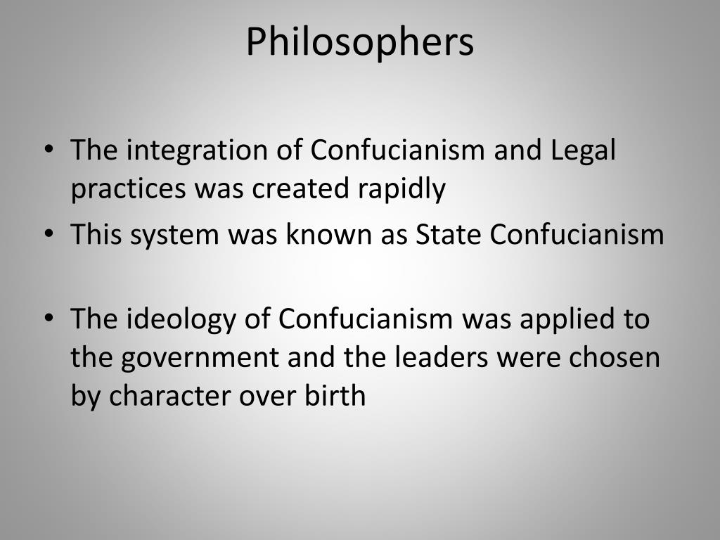 Philosophers • The integration of Confucianism and Legal practices was created rapidly • This system was known as State Confucianism • The ideology of Confucianism was applied to the government and the leaders were chosen by character over birth