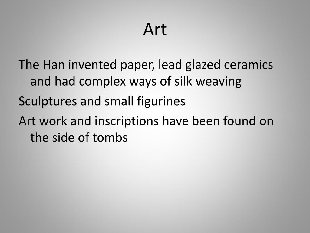 Art The Han invented paper, lead glazed ceramics and had complex ways of silk weaving Sculptures and small figurines Art work and inscriptions have been found on the side of tombs