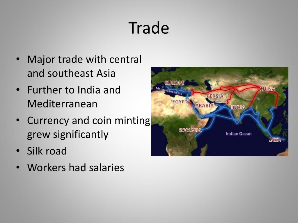 Trade • Major trade with central and southeast Asia • Further to India and Mediterranean • Currency and coin minting grew significantly • Silk road • Workers had salaries