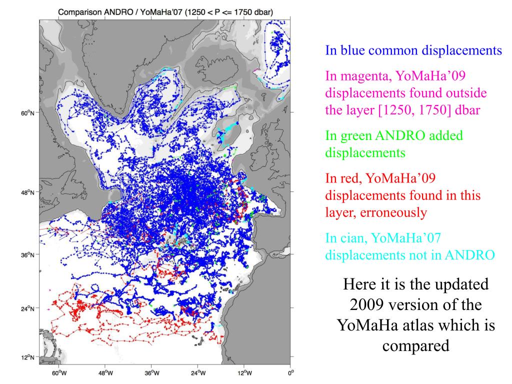 In blue common displacements In magenta, YoMaHa’09 displacements foundoutside the layer [1250, 1750] dbar In green ANDRO added displacements In red, YoMaHa’09 displacements found in this layer, erroneously In cian, YoMaHa’07 displacements not in ANDRO Here it is the updated 2009 version of the YoMaHa atlas which is compared