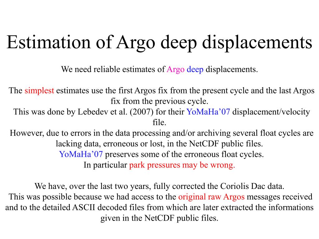 Estimation of Argo deep displacementsWe need reliable estimates of Argodeep displacements. The simplest estimates use the first Argos fix from the present cycle and the last Argos fix from the previous cycle. This was done by Lebedev et al. (2007) for their YoMaHa’07 displacement/velocity file. However, due to errors in the data processing and/or archiving several float cycles are lacking data, erroneous or lost, in the NetCDF public files.YoMaHa’07 preserves some of the erroneous float cycles. In particular park pressures may be wrong.We have, over the last two years, fully corrected the Coriolis Dac data. This was possible because we had access to the original raw Argos messages received and to the detailed ASCII decoded files from which are later extracted the informations given in the NetCDF public files.