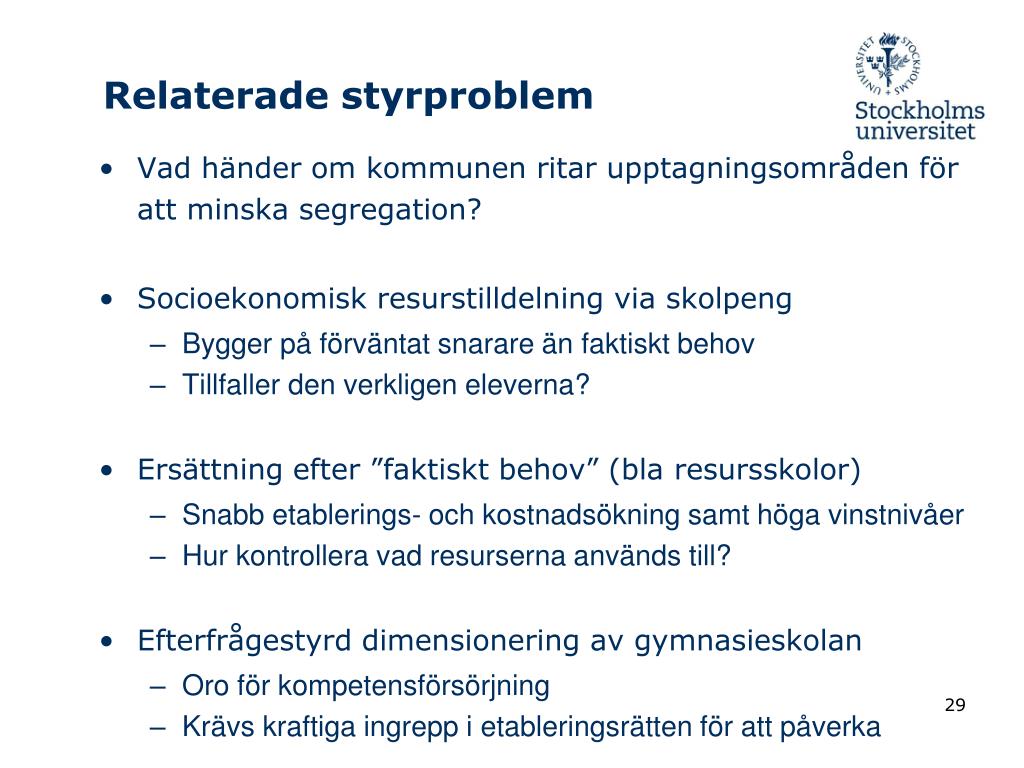 Relaterade styrproblem • Vad händer om kommunen ritar upptagningsområden för att minska segregation? • Socioekonomisk resurstilldelning via skolpeng • Bygger på förväntat snarare än faktiskt behov • Tillfaller den verkligen eleverna? • Ersättning efter ”faktiskt behov” (bla resursskolor) • Snabb etablerings- och kostnadsökning samt höga vinstnivåer • Hur kontrollera vad resurserna används till? • Efterfrågestyrd dimensionering av gymnasieskolan • Oro för kompetensförsörjning • Krävs kraftiga ingrepp i etableringsrätten för att påverka