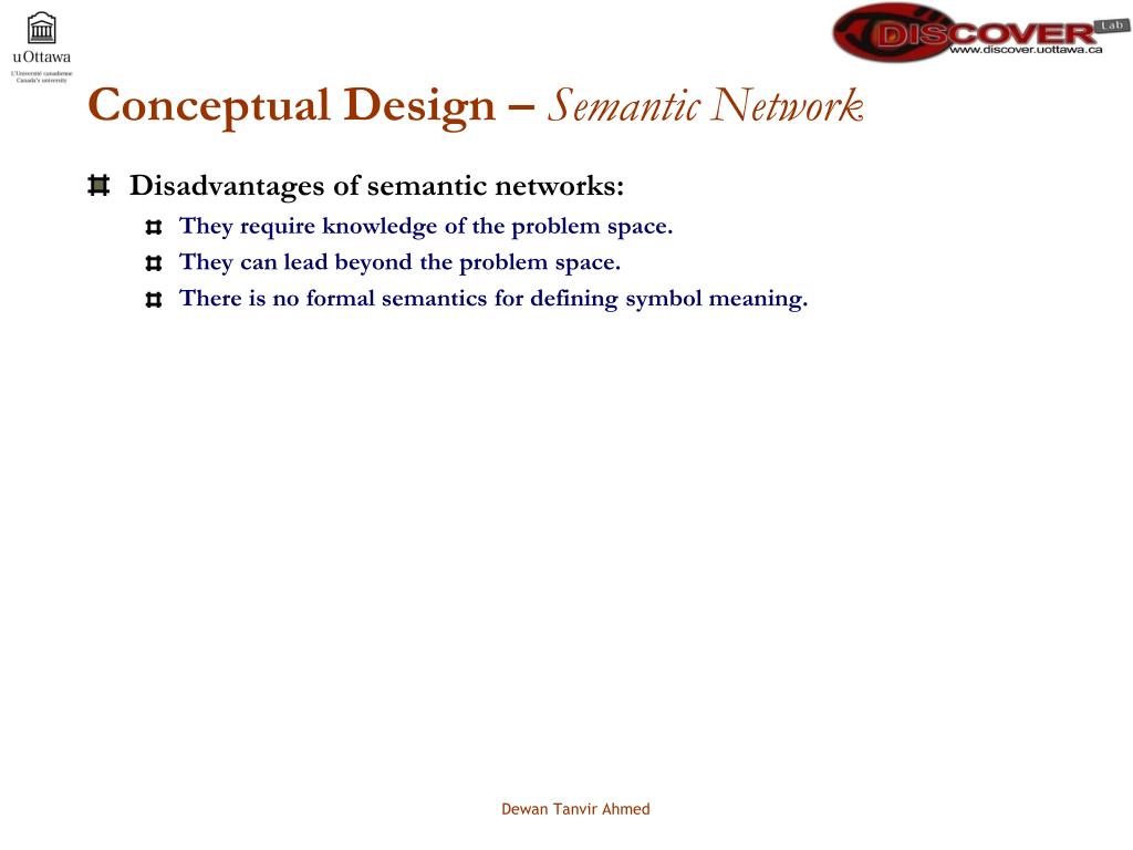 Conceptual Design – Semantic Network • Disadvantages of semantic networks: • They require knowledge of the problem space. • They can lead beyond the problem space. • There is no formal semantics for defining symbol meaning. Dewan Tanvir Ahmed