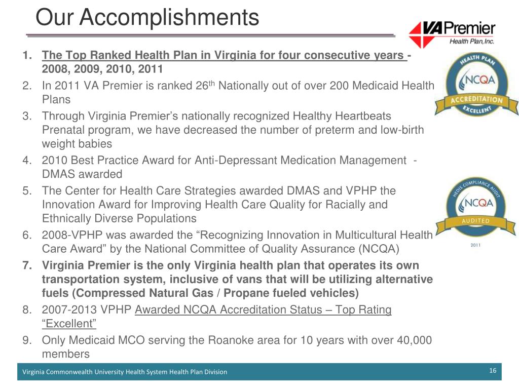 The Top Ranked Health Plan in Virginia for four consecutive years - 2008, 2009, 2010, 2011 In 2011 VA Premier is ranked 26th Nationally out of over 200 Medicaid Health Plans Through Virginia Premier’s nationally recognized Healthy Heartbeats Prenatal program, we have decreased the number of preterm and low-birth weight babies 2010 Best Practice Award for Anti-Depressant Medication Management - DMAS awarded The Center for Health Care Strategies awarded DMAS and VPHP the Innovation Award for Improving Health Care Quality for Racially and Ethnically Diverse Populations 2008-VPHP was awarded the “Recognizing Innovation in Multicultural Health Care Award” by the National Committee of Quality Assurance (NCQA) Virginia Premier is the only Virginia health plan that operates its own transportation system, inclusive of vans that will be utilizing alternative fuels (Compressed Natural Gas / Propane fueled vehicles) 2007-2013 VPHP Awarded NCQA Accreditation Status – Top Rating “Excellent” Only Medicaid MCO serving the Roanoke area for 10 years with over 40,000 members Our Accomplishments