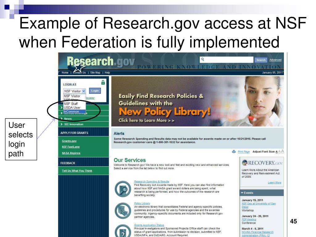 Example of Research.gov access at NSF when Federation is fully implemented User selects login path