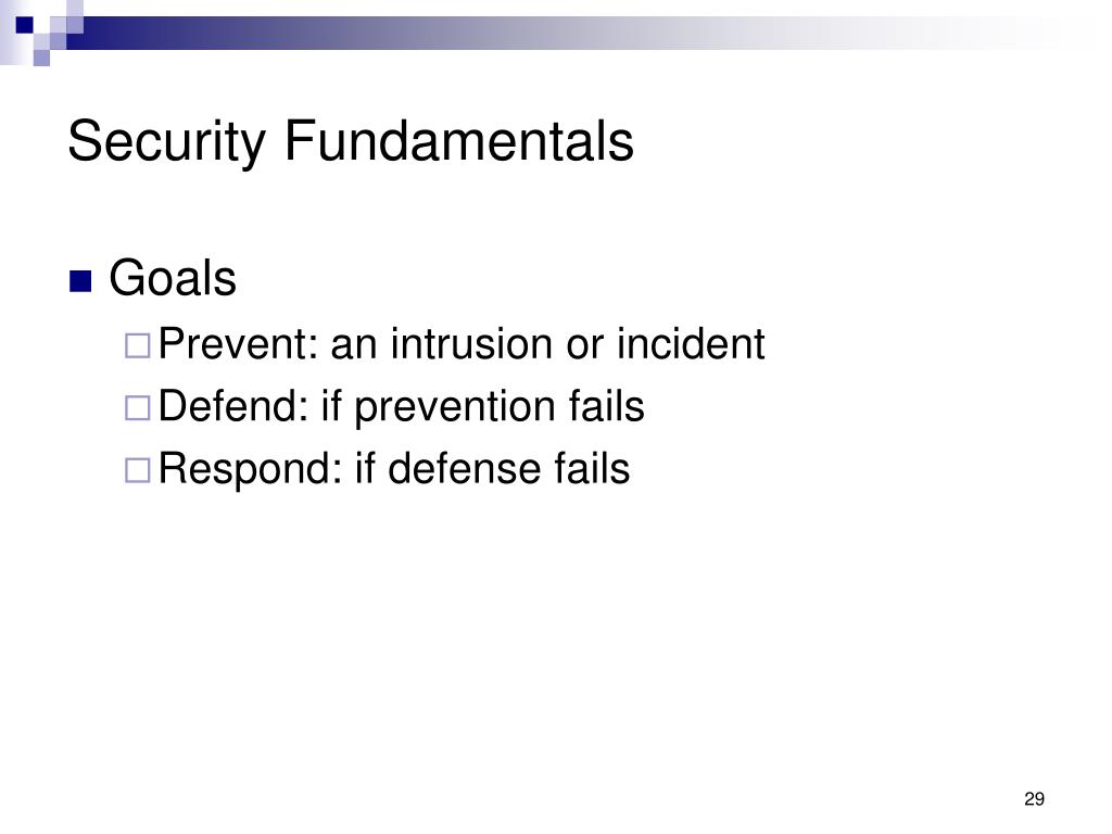Security Fundamentals Goals Prevent: an intrusion or incident Defend: if prevention fails Respond: if defense fails