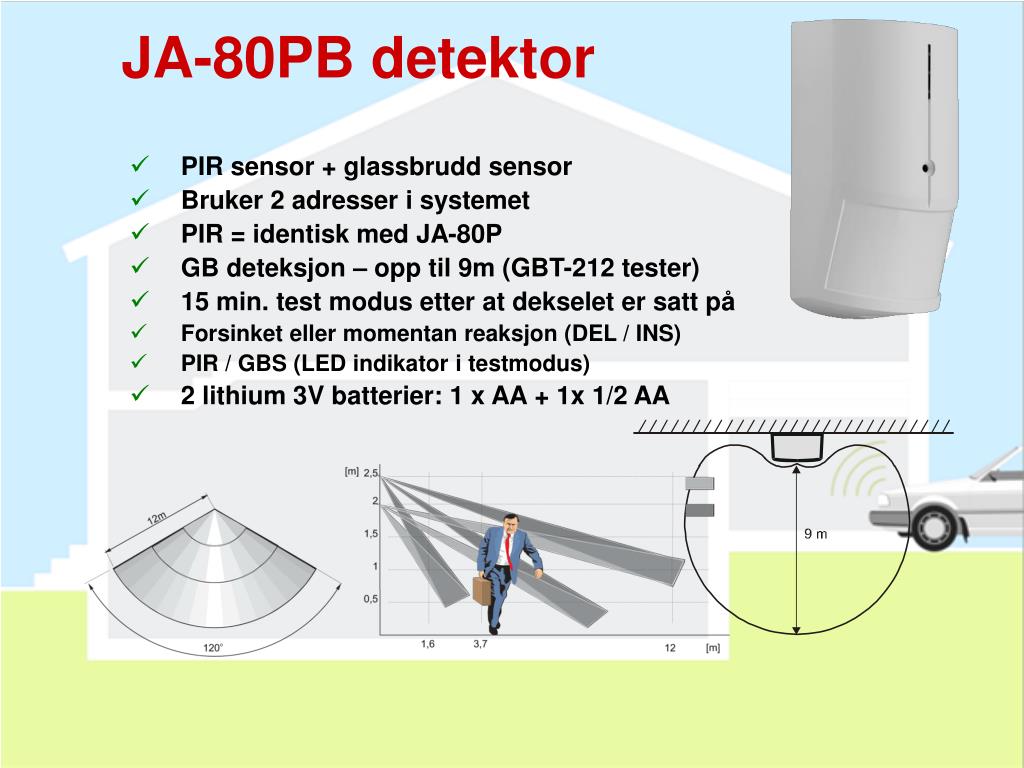 JA-80PB detektor • PIR sensor + glassbrudd sensor • Bruker 2 adresser i systemet • PIR = identisk med JA-80P • GB deteksjon – opp til 9m (GBT-212 tester) • 15 min. test modus etter at dekselet er satt på • Forsinket eller momentan reaksjon (DEL / INS) • PIR / GBS (LED indikator i testmodus) • 2 lithium 3V batterier: 1 x AA + 1x 1/2 AA