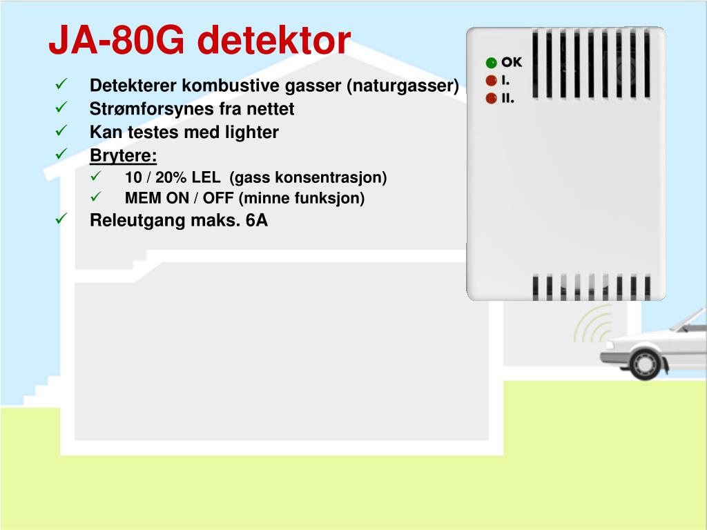 JA-80G detektor • Detekterer kombustive gasser (naturgasser) • Strømforsynes fra nettet • Kan testes med lighter • Brytere: • 10 / 20% LEL (gass konsentrasjon) • MEM ON / OFF (minne funksjon) • Releutgang maks. 6A