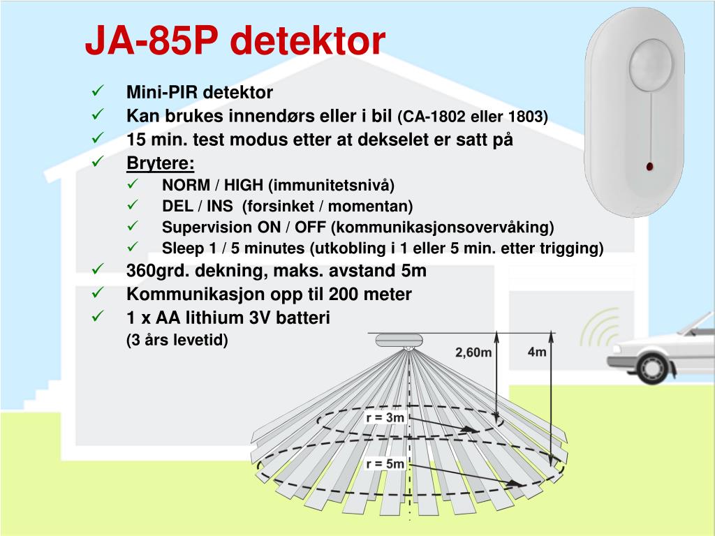 JA-85P detektor • Mini-PIR detektor • Kan brukes innendørs eller i bil (CA-1802 eller 1803) • 15 min. test modus etter at dekselet er satt på • Brytere: • NORM / HIGH (immunitetsnivå) • DEL / INS (forsinket / momentan) • Supervision ON / OFF (kommunikasjonsovervåking) • Sleep 1 / 5 minutes (utkobling i 1 eller 5 min. etter trigging) • 360grd. dekning, maks. avstand 5m • Kommunikasjon opp til 200 meter • 1 x AA lithium 3V batteri (3 års levetid)