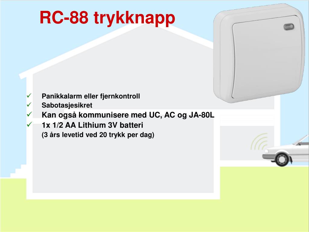 RC-88 trykknapp • Panikkalarm eller fjernkontroll • Sabotasjesikret • Kan også kommunisere med UC, AC og JA-80L • 1x 1/2 AA Lithium 3V batteri (3 års levetid ved 20 trykk per dag)
