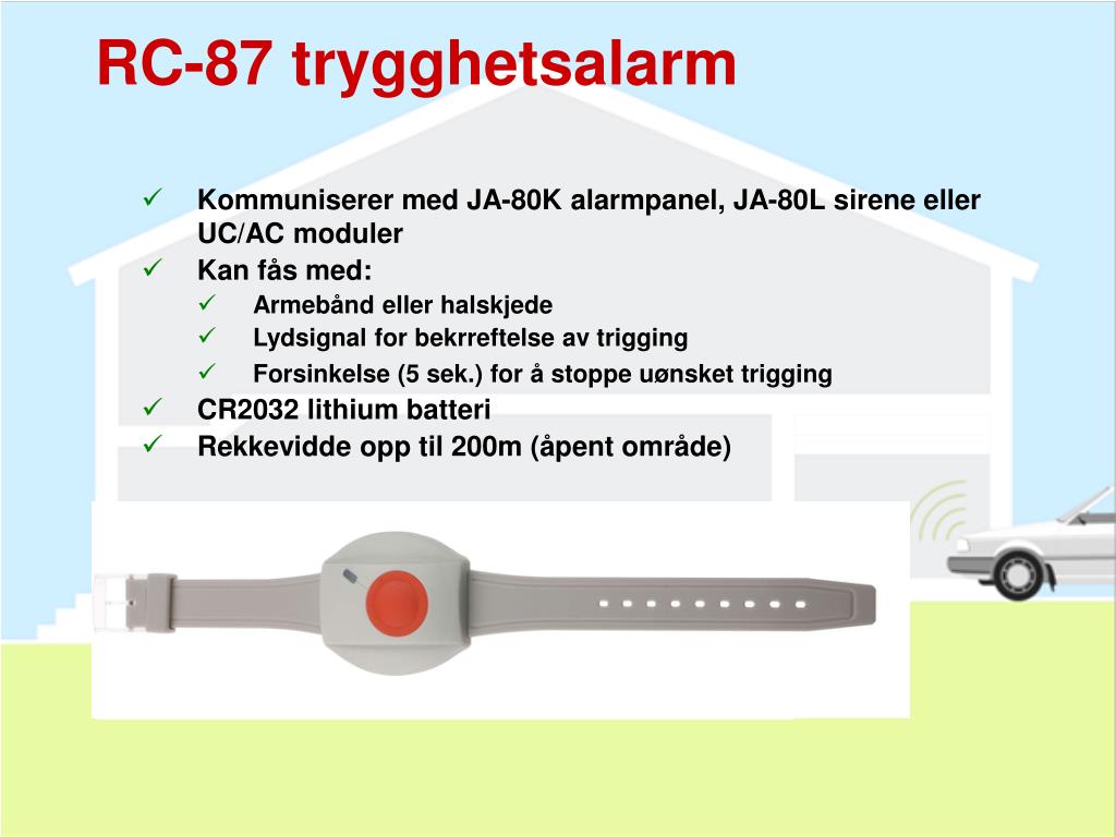 RC-87trygghetsalarm • Kommuniserer med JA-80K alarmpanel, JA-80L sirene eller UC/AC moduler • Kan fås med: • Armebånd eller halskjede • Lydsignal for bekrreftelse av trigging • Forsinkelse (5 sek.) for å stoppe uønsket trigging • CR2032 lithium batteri • Rekkevidde opp til 200m (åpent område)