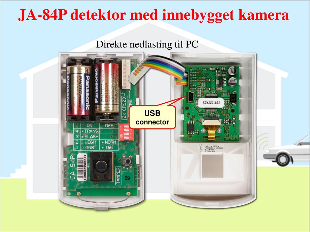 JA-84P detektor med innebygget kamera • Kameraoppløsning: 160 x 120 B&W • Toveis kommunikasjon • Tar 4 bilder når den trigger en bevegelse: • 1x uten blits • 3x med blits • Dekningsområde for blits: maks. 3 meters • Minne kapasitet: 61 bilder • USB port • Overføring av foto til alarmpanel: ca. 15 sek. • Batterier: 2x CR-123A • Levetid ca. 3 år (inkl. 100 bildeserier) • Testes med fjernkontrollen • 4 innstillinger: • DEL / INS (forsinket / mommentan reaksjon) • NORM / HIGH (PIR analysering) • ON / OFF Flash (blits på/av) • ON / OFF Trans (bildeoverføring)