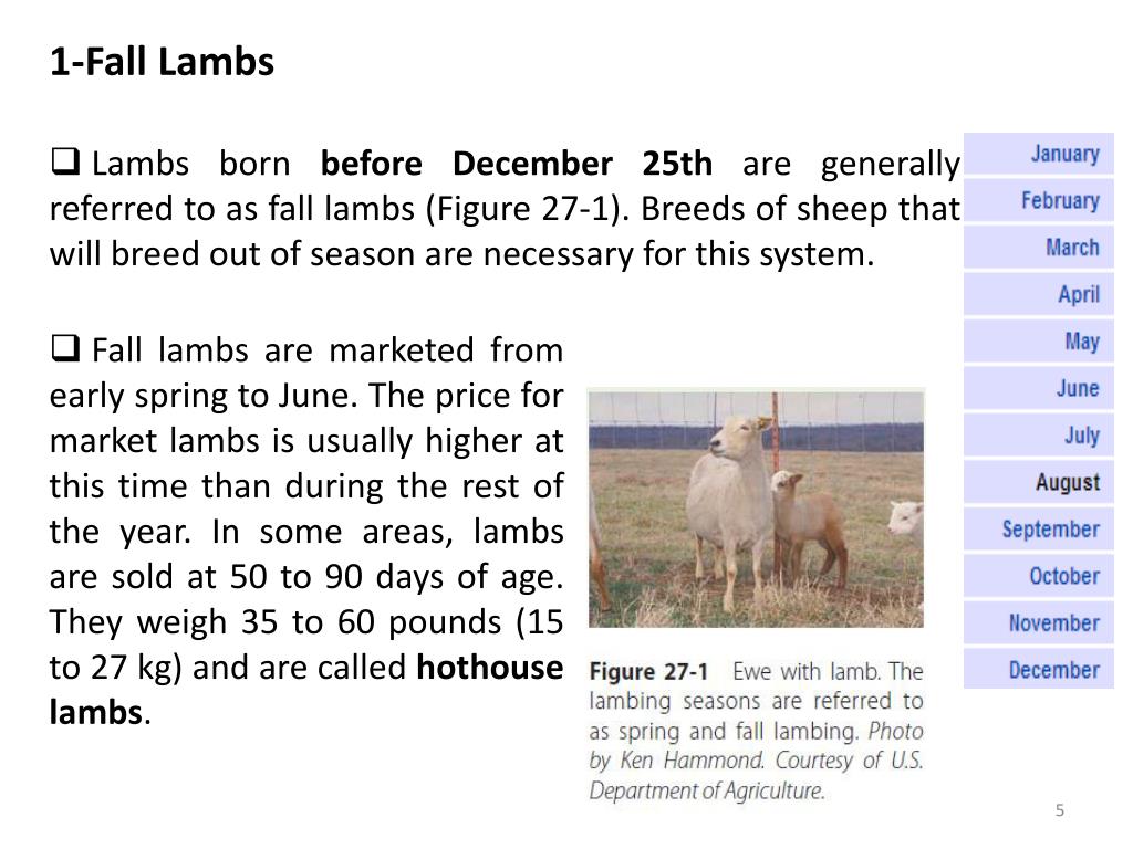 1-Fall Lambs • Lambs born before December 25th are generally referred to as fall lambs (Figure 27-1). Breeds of sheep that will breed out of season are necessary for this system. • Fall lambs are marketed from early spring to June. The price for market lambs is usually higher at this time than during the rest of the year. In some areas, lambs are sold at 50 to 90 days of age. They weigh 35 to 60 pounds (15 to 27 kg) and are called hothouse lambs.