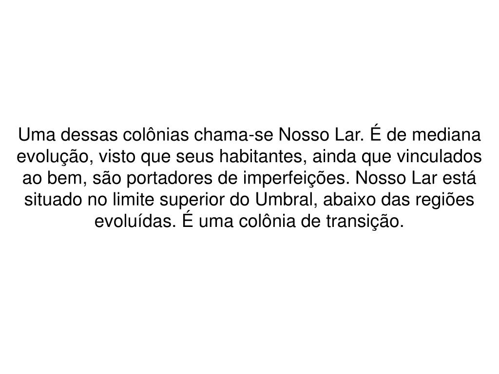 2.2 Exemplos de colônias espirituais Nosso Lar Fonte: Livro Nosso Lar, ditado pelo Espírito André Luiz, psicografia de Francisco Candido Xavier, edição FEB. Nas demais obras da série André Luiz, há referencias diretas e indiretas a respeito das atividades desta Colônia Espiritual. Nosso Lar é o exemplo de uma comunidade espiritual, situada na parte superior do Umbral e abaixo das regiões superiores. É, portanto, uma colônia de transição. Ali ainda existe sofrimento, mas os seus habitantes, sendo de mediana evolução, são mais esclarecidos. Essa posição espiritual favorece a natureza, caracterizada por belezas e harmonias inexistentes nos planos inferiores.