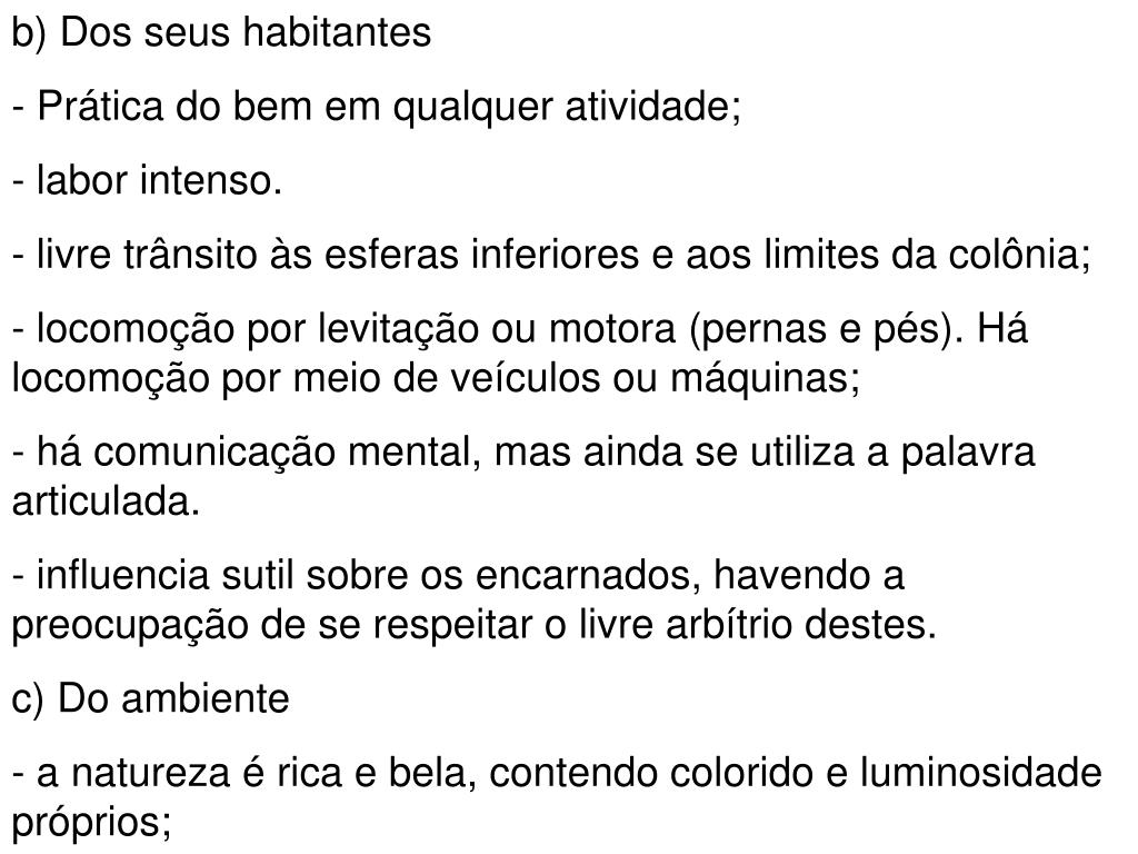 b) Dos seus habitantes - Prática do bem em qualquer atividade; - labor intenso. - livre trânsito às esferas inferiores e aos limites da colônia; - locomoção por levitação ou motora (pernas e pés). Há locomoção por meio de veículos ou máquinas; - há comunicação mental, mas ainda se utiliza a palavra articulada. - influencia sutil sobre os encarnados, havendo a preocupação de se respeitar o livre arbítrio destes. c) Do ambiente - a natureza é rica e bela, contendo colorido e luminosidade próprios;
