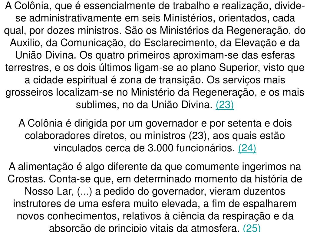 A Colônia, que é essencialmente de trabalho e realização, divide-se administrativamente em seis Ministérios, orientados, cada qual, por dozes ministros. São os Ministérios da Regeneração, do Auxilio, da Comunicação, do Esclarecimento, da Elevação e da União Divina. Os quatro primeiros aproximam-se das esferas terrestres, e os dois últimos ligam-se ao plano Superior, visto que a cidade espiritual é zona de transição. Os serviços mais grosseiros localizam-se no Ministério da Regeneração, e os mais sublimes, no da União Divina. (23) A Colônia é dirigida por um governador e por setenta e dois colaboradores diretos, ou ministros (23), aos quais estão vinculados cerca de 3.000 funcionários. (24) A alimentação é algo diferente da que comumente ingerimos na Crostas. Conta-se que, em determinado momento da história de Nosso Lar, (...) a pedido do governador, vieram duzentos instrutores de uma esfera muito elevada, a fim de espalharem novos conhecimentos, relativos à ciência da respiração e da absorção de principio vitais da atmosfera. (25)
