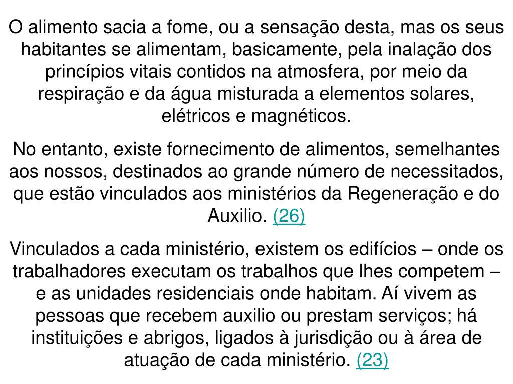 O alimento sacia a fome, ou a sensação desta, mas os seus habitantes se alimentam, basicamente, pela inalação dos princípios vitais contidos na atmosfera, por meio da respiração e da água misturada a elementos solares, elétricos e magnéticos. No entanto, existe fornecimento de alimentos, semelhantes aos nossos, destinados ao grande número de necessitados, que estão vinculados aos ministérios da Regeneração e do Auxilio. (26) Vinculados a cada ministério, existem os edifícios – onde os trabalhadores executam os trabalhos que lhes competem – e as unidades residenciais onde habitam. Aí vivem as pessoas que recebem auxilio ou prestam serviços; há instituições e abrigos, ligados à jurisdição ou à área de atuação de cada ministério. (23)