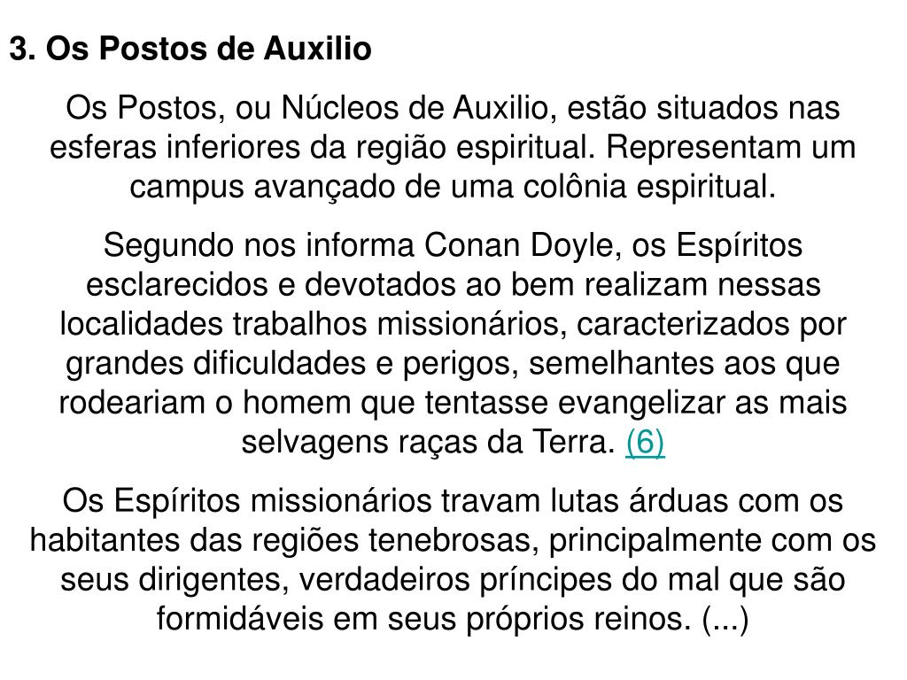 3. Os Postos de Auxilio Os Postos, ou Núcleos de Auxilio, estão situados nas esferas inferiores da região espiritual. Representam um campus avançado de uma colônia espiritual. Segundo nos informa Conan Doyle, os Espíritos esclarecidos e devotados ao bem realizam nessas localidades trabalhos missionários, caracterizados por grandes dificuldades e perigos, semelhantes aos que rodeariam o homem que tentasse evangelizar as mais selvagens raças da Terra. (6) Os Espíritos missionários travam lutas árduas com os habitantes das regiões tenebrosas, principalmente com os seus dirigentes, verdadeiros príncipes do mal que são formidáveis em seus próprios reinos. (...)