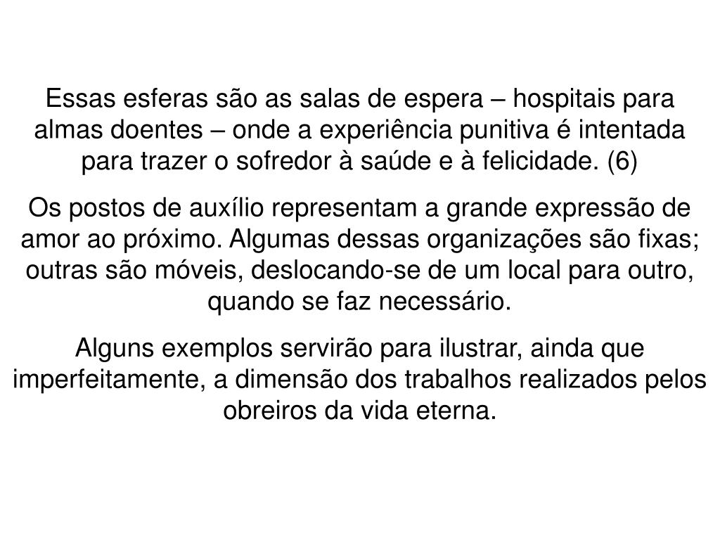 Essas esferas são as salas de espera – hospitais para almas doentes – onde a experiência punitiva é intentada para trazer o sofredor à saúde e à felicidade. (6) Os postos de auxílio representam a grande expressão de amor ao próximo. Algumas dessas organizações são fixas; outras são móveis, deslocando-se de um local para outro, quando se faz necessário. Alguns exemplos servirão para ilustrar, ainda que imperfeitamente, a dimensão dos trabalhos realizados pelos obreiros da vida eterna.