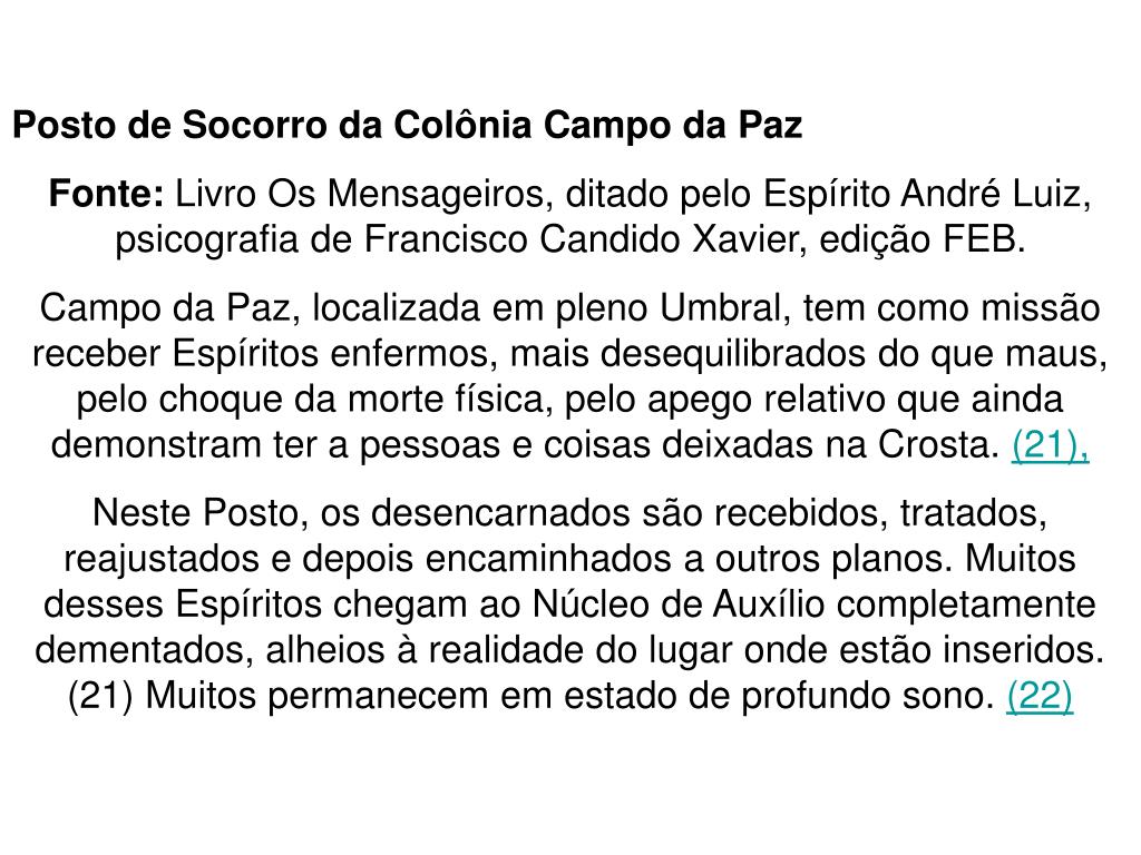 Posto de Socorro da Colônia Campo da Paz Fonte: Livro Os Mensageiros, ditado pelo Espírito André Luiz, psicografia de Francisco Candido Xavier, edição FEB. Campo da Paz, localizada em pleno Umbral, tem como missão receber Espíritos enfermos, mais desequilibrados do que maus, pelo choque da morte física, pelo apego relativo que ainda demonstram ter a pessoas e coisas deixadas na Crosta. (21), Neste Posto, os desencarnados são recebidos, tratados, reajustados e depois encaminhados a outros planos. Muitos desses Espíritos chegam ao Núcleo de Auxílio completamente dementados, alheios à realidade do lugar onde estão inseridos. (21) Muitos permanecem em estado de profundo sono. (22)