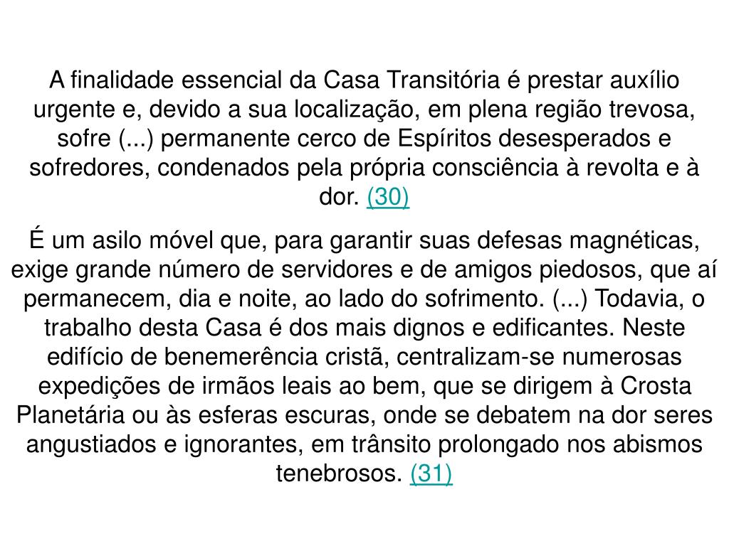 A finalidade essencial da Casa Transitória é prestar auxílio urgente e, devido a sua localização, em plena região trevosa, sofre (...) permanente cerco de Espíritos desesperados e sofredores, condenados pela própria consciência à revolta e à dor. (30) É um asilo móvel que, para garantir suas defesas magnéticas, exige grande número de servidores e de amigos piedosos, que aí permanecem, dia e noite, ao lado do sofrimento. (...) Todavia, o trabalho desta Casa é dos mais dignos e edificantes. Neste edifício de benemerência cristã, centralizam-se numerosas expedições de irmãos leais ao bem, que se dirigem à Crosta Planetária ou às esferas escuras, onde se debatem na dor seres angustiados e ignorantes, em trânsito prolongado nos abismos tenebrosos. (31)