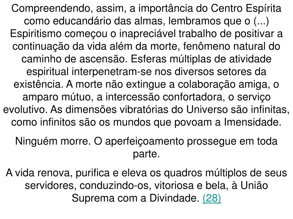 Compreendendo, assim, a importância do Centro Espírita como educandário das almas, lembramos que o (...) Espiritismo começou o inapreciável trabalho de positivar a continuação da vida além da morte, fenômeno natural do caminho de ascensão. Esferas múltiplas de atividade espiritual interpenetram-se nos diversos setores da existência. A morte não extingue a colaboração amiga, o amparo mútuo, a intercessão confortadora, o serviço evolutivo. As dimensões vibratórias do Universo são infinitas, como infinitos são os mundos que povoam a Imensidade. Ninguém morre. O aperfeiçoamento prossegue em toda parte. A vida renova, purifica e eleva os quadros múltiplos de seus servidores, conduzindo-os, vitoriosa e bela, à União Suprema com a Divindade. (28)