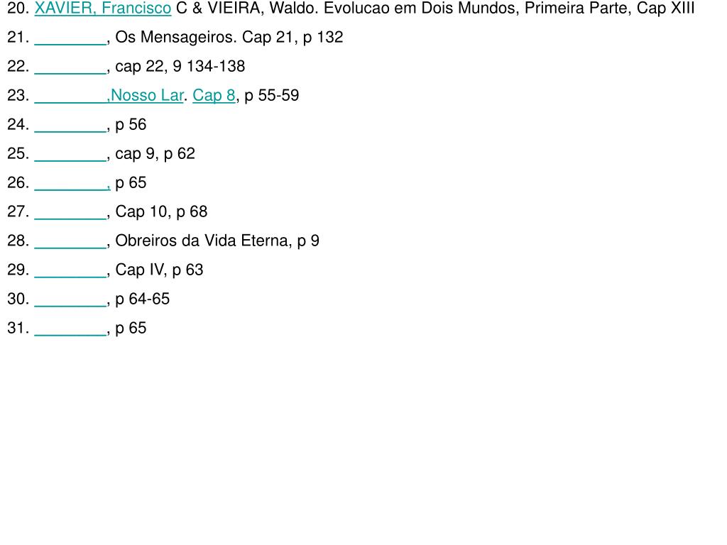 XAVIER, Francisco C & VIEIRA, Waldo. Evolucao em Dois Mundos, Primeira Parte, Cap XIII • ________, Os Mensageiros. Cap 21, p 132 • ________, cap 22, 9 134-138 • ________,Nosso Lar. Cap 8, p 55-59 • ________, p 56 • ________, cap 9, p 62 • ________, p 65 • ________, Cap 10, p 68 • ________, Obreiros da Vida Eterna, p 9 • ________, Cap IV, p 63 • ________, p 64-65 • ________, p 65