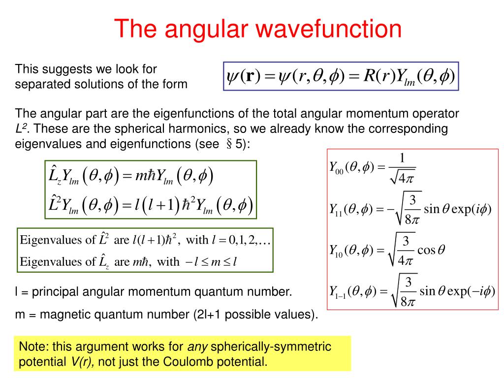 The angular wavefunction This suggests we look for separated solutions of the form The angular part are the eigenfunctions of the total angular momentum operator L2. These are the spherical harmonics, so we already know the corresponding eigenvalues and eigenfunctions (see §5): l = principal angular momentum quantum number. m = magnetic quantum number (2l+1 possible values). Note: this argument works for any spherically-symmetric potential V(r), not just the Coulomb potential.