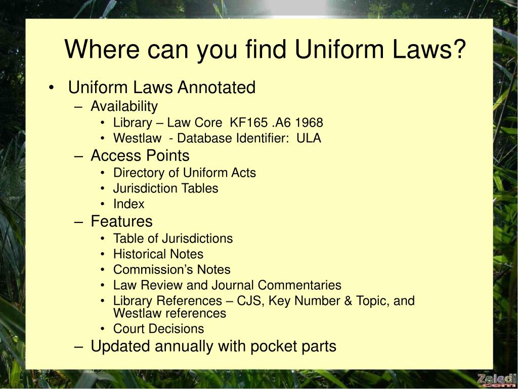 Where can you find Uniform Laws? • Uniform Laws Annotated • Availability • Library – Law Core KF165 .A6 1968 • Westlaw - Database Identifier: ULA • Access Points • Directory of Uniform Acts • Jurisdiction Tables • Index • Features • Table of Jurisdictions • Historical Notes • Commission’s Notes • Law Review and Journal Commentaries • Library References – CJS, Key Number & Topic, and Westlaw references • Court Decisions • Updated annually with pocket parts