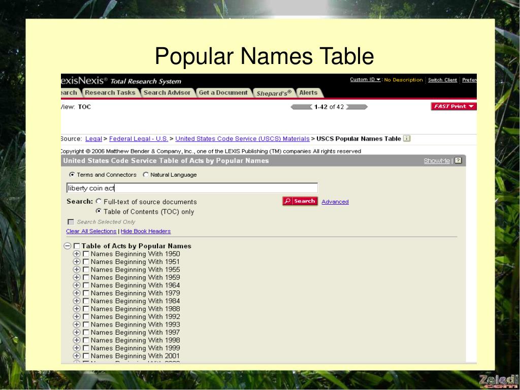 Popular Names Table Lexis Popular Names Table • search full-text of table or TOC • browse table of contents Westlaw Popular Names Table • Contains browse feature only • Provides parallel table for Public Law section to USC section.