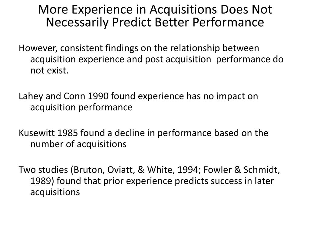 More Experience in Acquisitions Does Not Necessarily Predict Better Performance However, consistent findings on the relationship between acquisition experience and post acquisition performance do not exist. Lahey and Conn 1990 found experience has no impact on acquisition performance Kusewitt 1985 found a decline in performance based on the number of acquisitions Two studies (Bruton, Oviatt, & White, 1994; Fowler & Schmidt, 1989) found that prior experience predicts success in later acquisitions