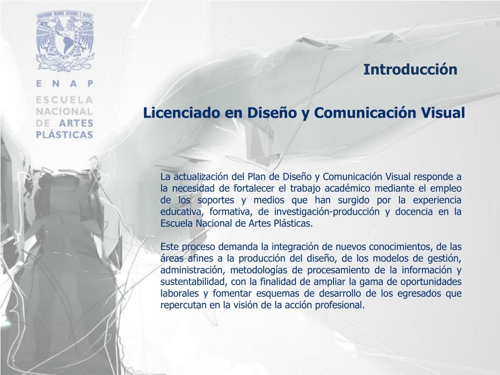 Introducción Licenciado en Diseño y Comunicación Visual La actualización del Plan de Diseño y Comunicación Visual responde a la necesidad de fortalecer el trabajo académico mediante el empleo de los soportes y medios que han surgido por la experiencia educativa, formativa, de investigación-producción y docencia en la Escuela Nacional de Artes Plásticas. Este proceso demanda la integración de nuevos conocimientos, de las áreas afines a la producción del diseño, de los modelos de gestión, administración, metodologías de procesamiento de la información y sustentabilidad, con la finalidad de ampliar la gama de oportunidades laborales y fomentar esquemas de desarrollo de los egresados que repercutan en la visión de la acción profesional.