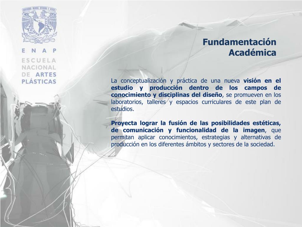 Fundamentación Académica La ENAP se encuentra en plena actividad y transformación académica y por ello es necesario evaluar y detectar oportunidades de cambio para seguir impulsando la innovación en las disciplinas del diseño y la comunicación visual, a fin de lograr un impacto significativo en nuestro entorno. Por lo que es pertinente generar un proceso de desarrollo, que promueva una nueva visión en los modelos educativos, procesos de enseñanza, de investigación-producción, así como de gestión de la profesión para derivarlos en beneficio del entorno y contextos del egresado.