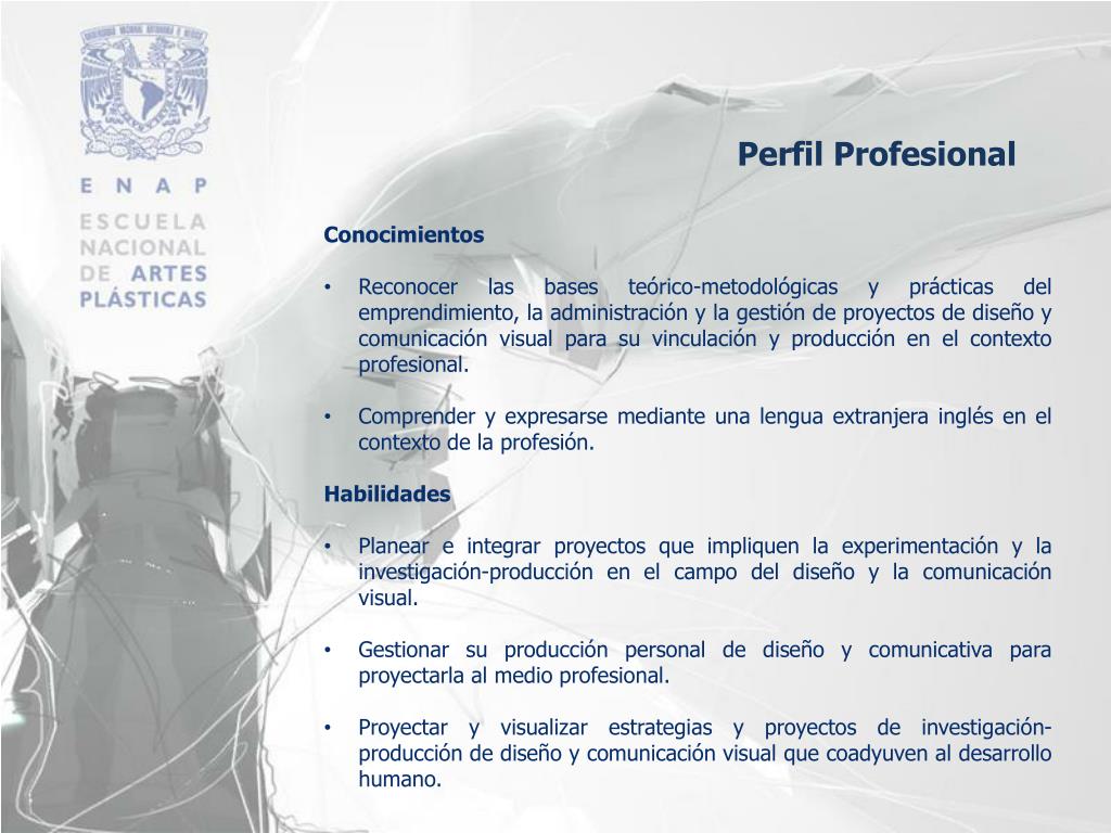 Perfil Profesional • Conocimientos • Reconocer las bases teórico-metodológicas y prácticas del emprendimiento, la administración y la gestión de proyectos de diseño y comunicación visual para su vinculación y producción en el contexto profesional. • Comprender y expresarse mediante una lengua extranjera inglés en el contexto de la profesión. • Habilidades • Planear e integrar proyectos que impliquen la experimentación y la investigación-producción en el campo del diseño y la comunicación visual. • Gestionar su producción personal de diseño y comunicativa para proyectarla al medio profesional. • Proyectar y visualizar estrategias y proyectos de investigación-producción de diseño y comunicación visual que coadyuven al desarrollo humano.
