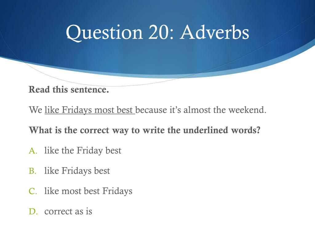 Question 20: Adverbs Read this sentence. We like Fridays most best because it’s almost the weekend. What is the correct way to write the underlined words? • like the Friday best • like Fridays best • like most best Fridays • correct as is