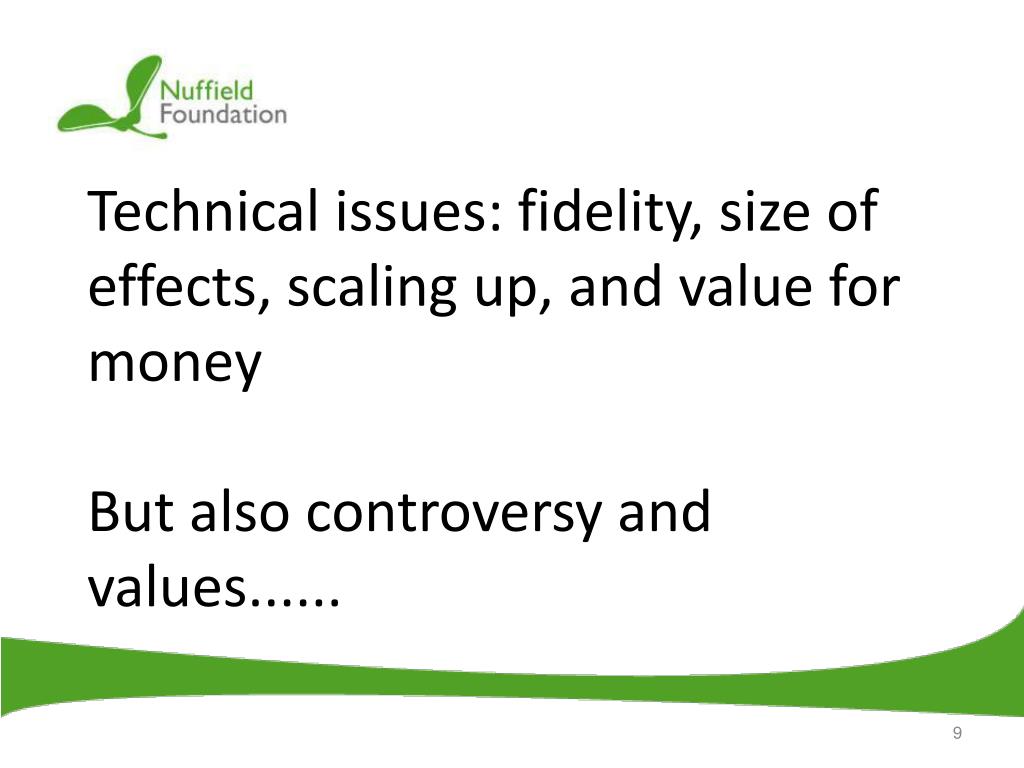 Technical issues: fidelity, size of effects, scaling up, and value for moneyBut also controversy and values......