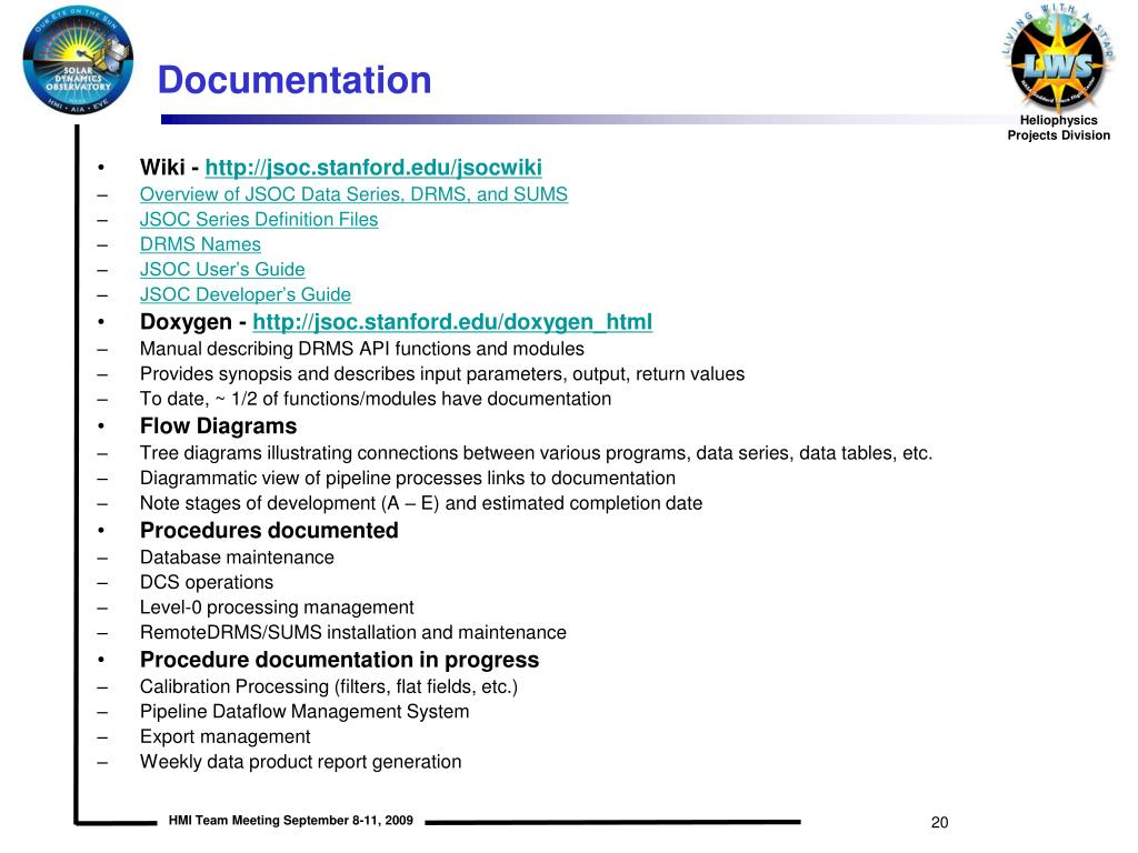 Documentation • Wiki - http://jsoc.stanford.edu/jsocwiki • Overview of JSOC Data Series, DRMS, and SUMS • JSOC Series Definition Files • DRMS Names • JSOC User’s Guide • JSOC Developer’s Guide • Doxygen - http://jsoc.stanford.edu/doxygen_html • Manual describing DRMS API functions and modules • Provides synopsis and describes input parameters, output, return values • To date, ~ 1/2 of functions/modules have documentation • Flow Diagrams • Tree diagrams illustrating connections between various programs, data series, data tables, etc. • Diagrammatic view of pipeline processes links to documentation • Note stages of development (A – E) and estimated completion date • Procedures documented • Database maintenance • DCS operations • Level-0 processing management • RemoteDRMS/SUMS installation and maintenance • Procedure documentation in progress • Calibration Processing (filters, flat fields, etc.) • Pipeline Dataflow Management System • Export management • Weekly data product report generation