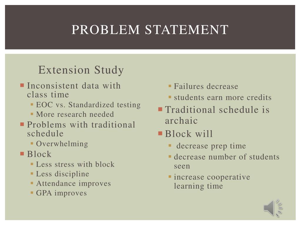 Problem Statement Extension Study Failures decrease students earn more credits Traditional schedule is archaic Block will decrease prep time decrease number of students seen increase cooperative learning time • Inconsistent data with class time • EOC vs. Standardized testing • More research needed • Problems with traditional schedule • Overwhelming • Block • Less stress with block • Less discipline • Attendance improves • GPA improves