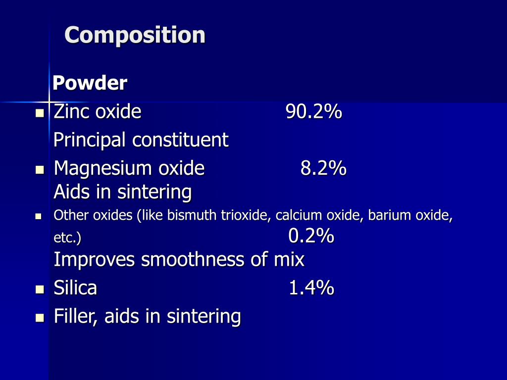 Composition Powder • Zinc oxide 90.2% Principal constituent • Magnesium oxide 8.2% Aids in sintering • Other oxides (like bismuth trioxide, calcium oxide, barium oxide, etc.) 0.2% Improves smoothness of mix • Silica 1.4% • Filler, aids in sintering