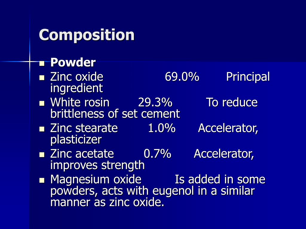 Composition • Powder • Zinc oxide 69.0% Principal ingredient • White rosin 29.3% To reduce brittleness of set cement • Zinc stearate 1.0% Accelerator, plasticizer • Zinc acetate 0.7% Accelerator, improves strength • Magnesium oxide Is added in some powders, acts with eugenol in a similar manner as zinc oxide.