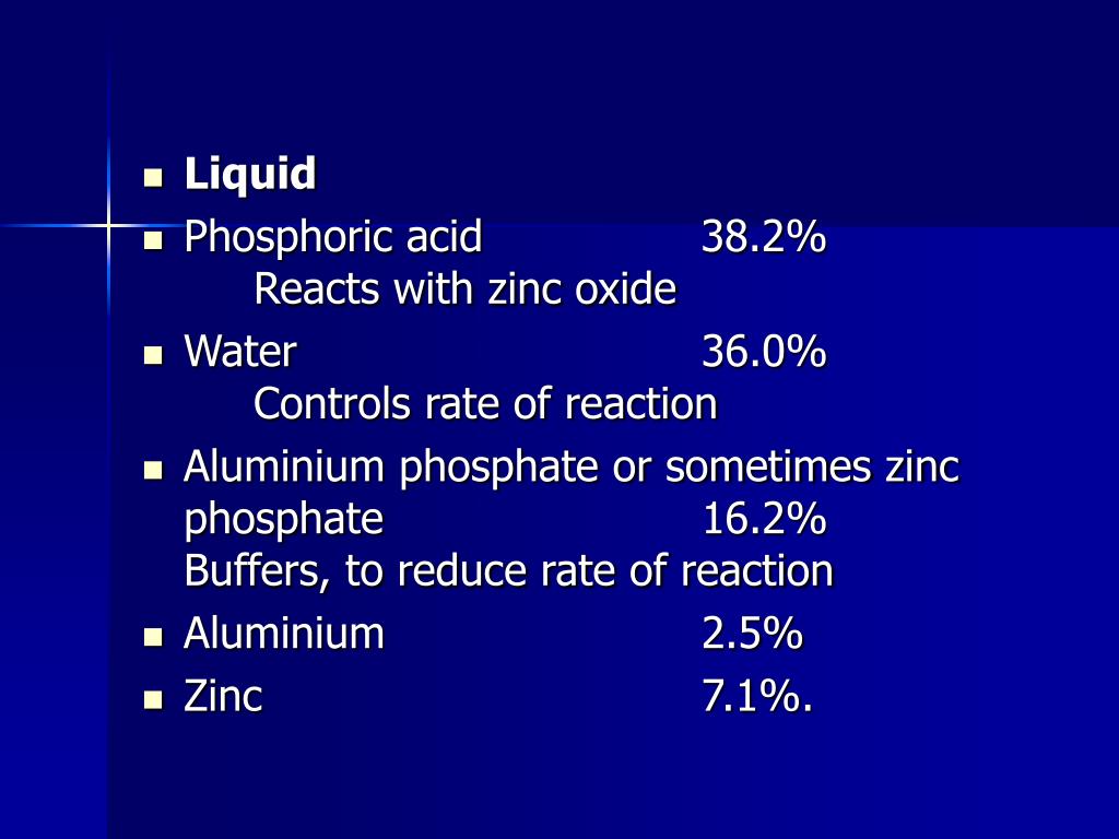 Liquid • Phosphoric acid 38.2% Reacts with zinc oxide • Water 36.0% Controls rate of reaction • Aluminium phosphate or sometimes zinc phosphate 16.2% Buffers, to reduce rate of reaction • Aluminium 2.5% • Zinc 7.1%.