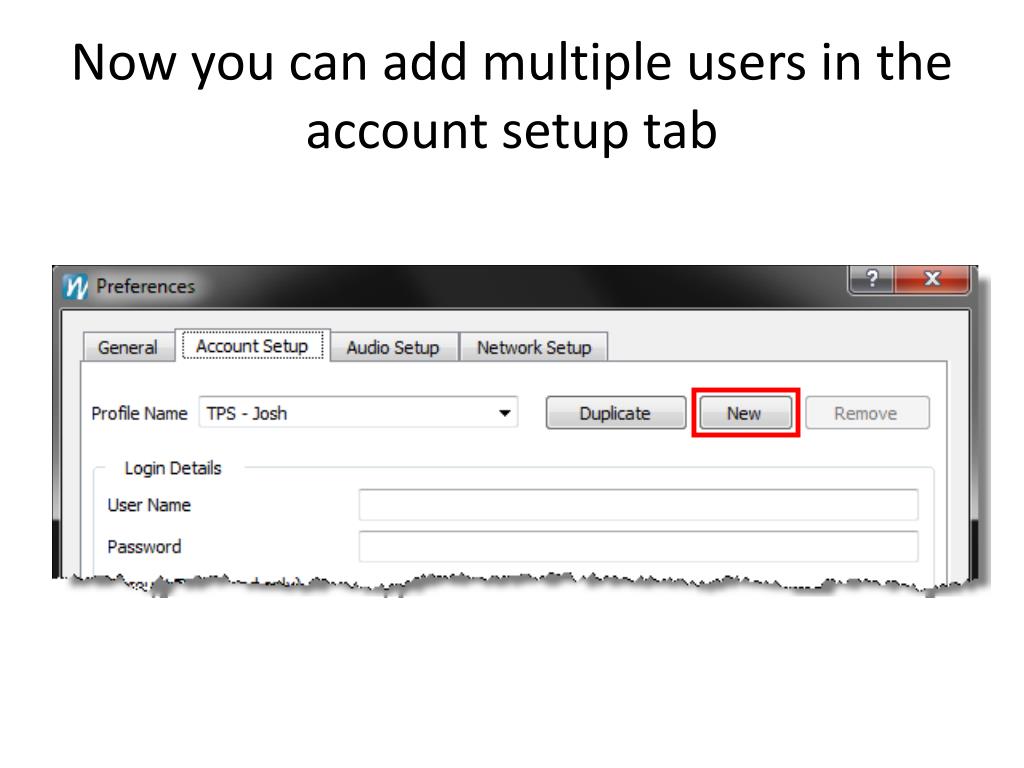 Setting up multiple accounts in the web conference tool. First Click Tools Then Click Preferences. Then go to the “account setup” tab and click “manage multiple login profiles”:. Click Yes. Now you can add multiple users in the account setup tab.
