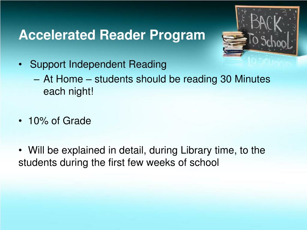 Accelerated Reader Program • Support Independent Reading • At Home – students should be reading 30 Minutes each night! • 10% of Grade • Will be explained in detail, during Library time, to the students during the first few weeks of school