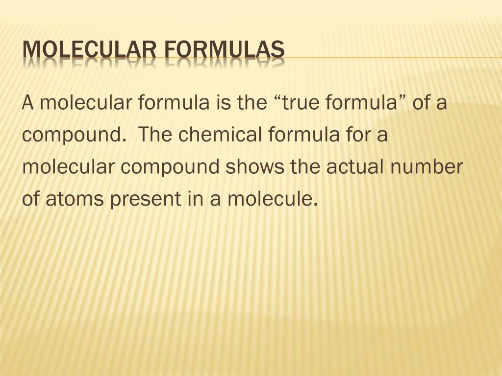 A molecular formula is the “true formula” of a compound. The chemical formula for a molecular compound shows the actual number of atoms present in a molecule. MOLECULAR FORMULAS