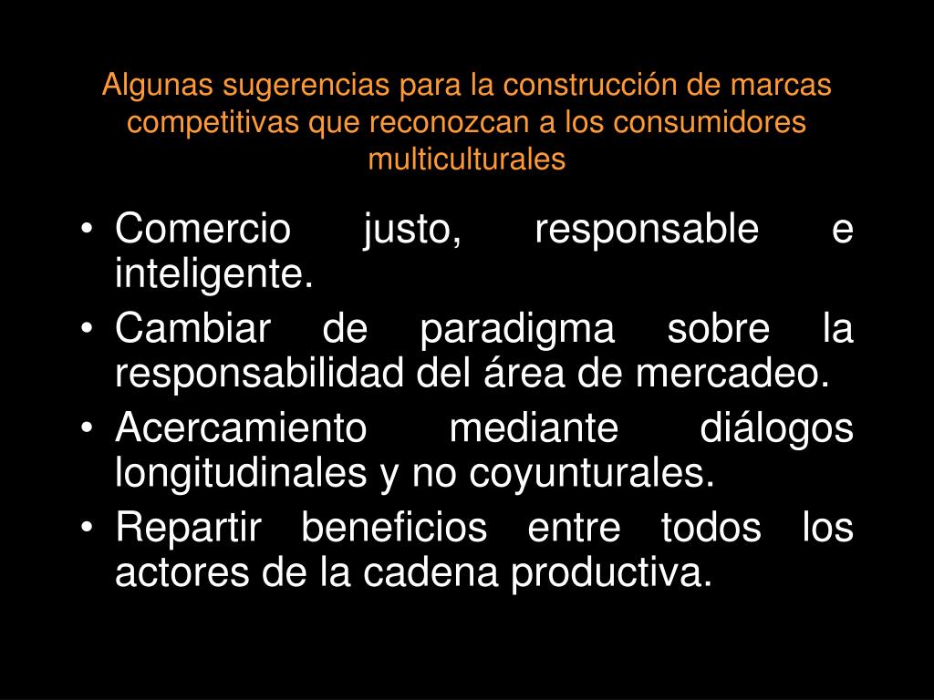 Algunas sugerencias para la construcción de marcas competitivas que reconozcan a los consumidores multiculturales • Comercio justo, responsable e inteligente. • Cambiar de paradigma sobre la responsabilidad del área de mercadeo. • Acercamiento mediante diálogos longitudinales y no coyunturales. • Repartir beneficios entre todos los actores de la cadena productiva.