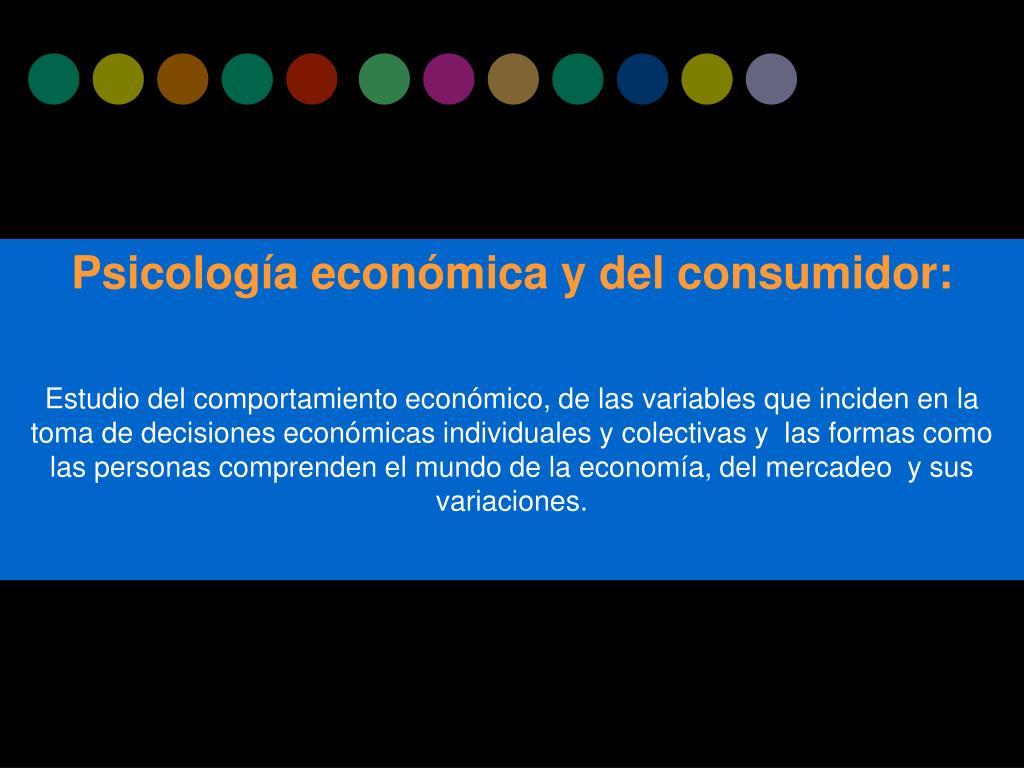 Psicología económica y del consumidor: Estudio del comportamiento económico, de las variables que inciden en la toma de decisiones económicas individuales y colectivas y las formas como las personas comprenden el mundo de la economía, del mercadeo y sus variaciones.